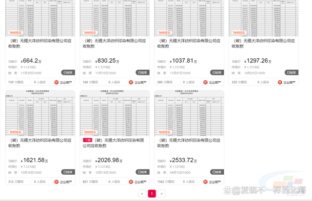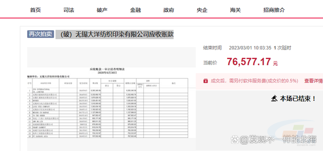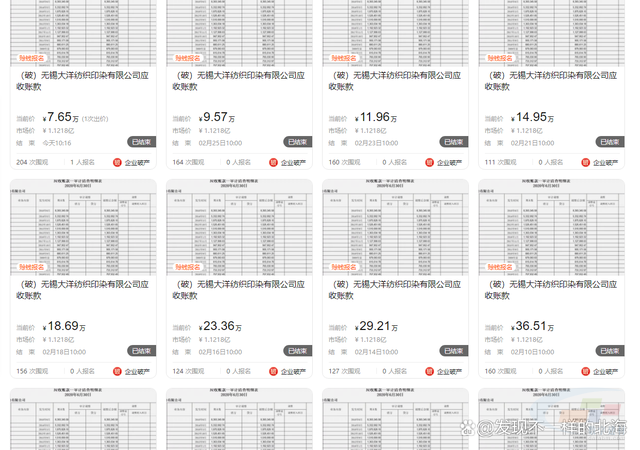 值得注意的是,这次无锡大洋纺织印染有限公司应收账款拍卖,已经是第27次拍卖了。第一次拍卖的时候,起拍价是高达2533.72万元,流拍后就开启不断降价拍卖,从千万级别的起拍价降到百万级别、十万级别,直到这次只要7万多起。