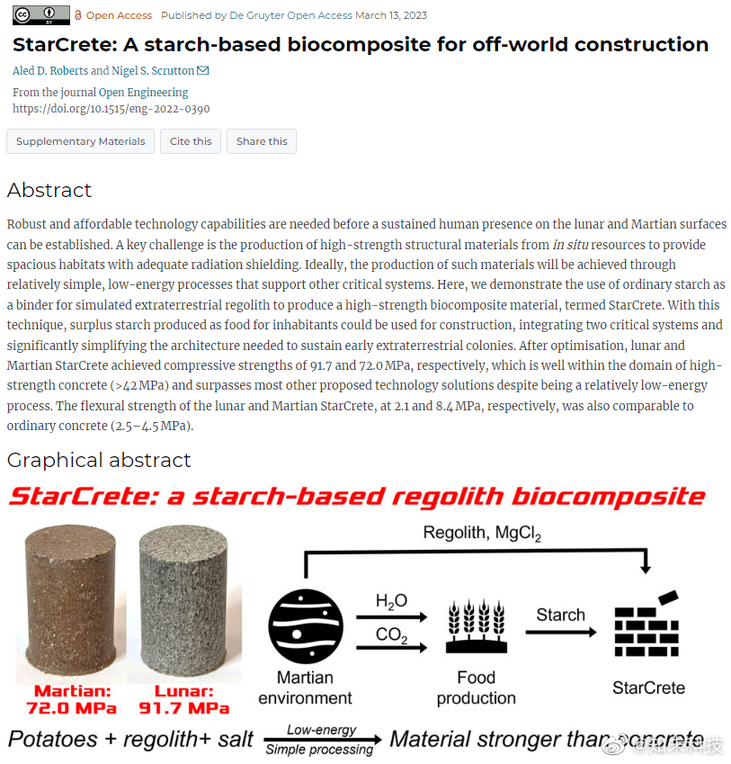 据IT之家消息,曼彻斯特大学的科学家们发明了一种新型材料,名为星际混凝土(StarCrete),它由外太空尘埃、马铃薯淀粉和少许盐制成,强度是普通混凝土的2倍,可以用来在火星上建造房屋。