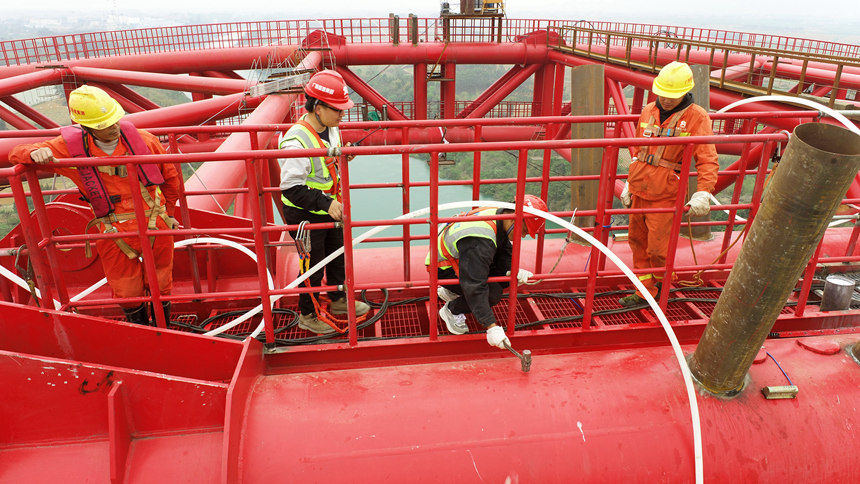 技术员通过敲击掌握混凝土灌注进度。周岩松摄