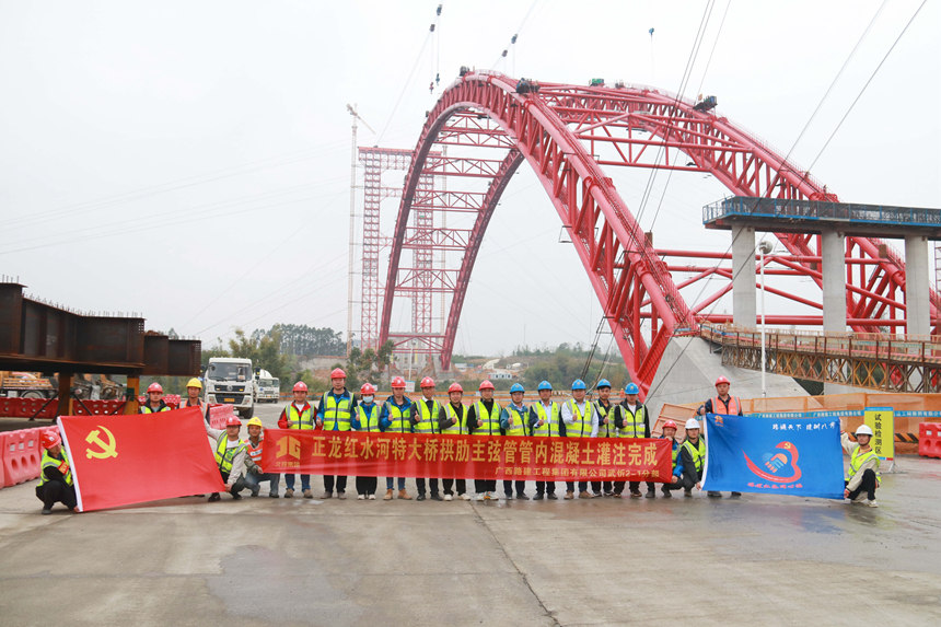 3月14日晚,历经15天的紧张施工,由广西北部湾投资集团有限公司直属企业广西新发展交通集团有限公司投资建设、广西路建工程集团有限公司(以下简称“广西路建集团”)承建的正龙红水河特大桥最后一根拱肋主弦管管内混凝土完成灌注。至此,全桥拱肋主弦管全部完成灌注施工,即将进入格子梁吊装施工阶段。