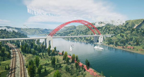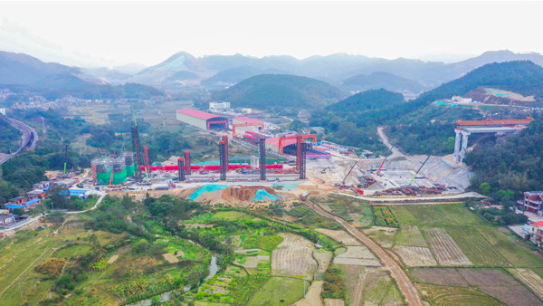 平陆运河旧州特大桥是南宁—湛江高速公路南宁至博白那卜段的重点控制性工程,该桥全长约525米,主桥跨越平陆运河,引桥跨越黎钦铁路,主桥为跨径260米的下承式钢管混凝土系杆拱桥。该桥主墩基础为分离式沉井基础,是广西在建最大沉井,采用泡沫混凝土回填工艺,在全国尚属首次;拱肋施工采用“低位拼装+中段拱肋门架法”整体提升施工工艺,提升节段长度为202米,提升重量约1700吨,一次提升高度达63米,是目前世界最大整体提升跨径和吨位的钢管混凝土拱桥。