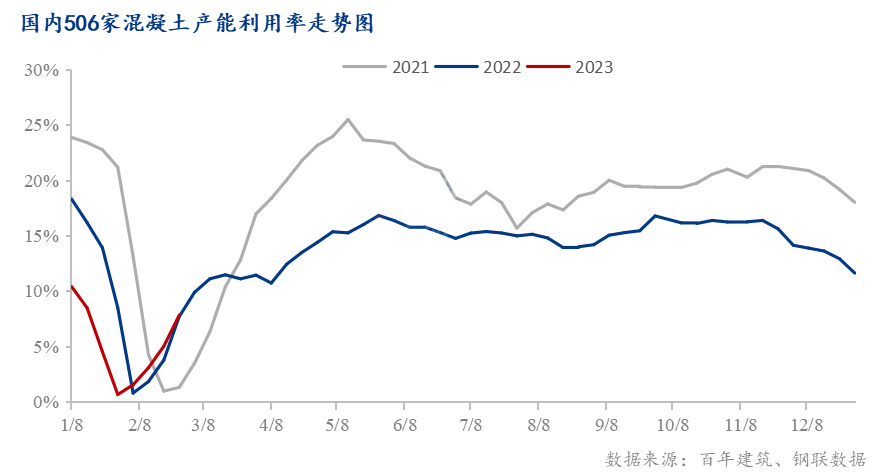 样本说明:本轮调研时间为2月22日-3月1日期间,样本总量为506个混凝土搅拌站,区域占比:华东23.28%、华中16.43%、华南17.12%、华北21.23%、西南15.1%、西北2.7%、东北4.14%;产能利用率=周产量/周设计产能;混凝土企业正常平均产能利用率维持在30%左右。