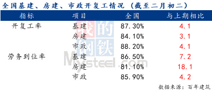 三、国内房地产复工情况及劳务到岗均恢复到80%以上