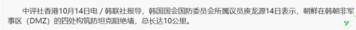 10月14日,韩国国民力量党议员庾龙源披露,朝鲜已在朝韩军事分界线以北区域修建了一道长达10公里的反坦克屏障。