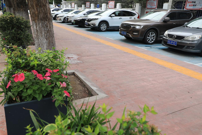 不溅“裤脚”人行道11月12日,在新洲区实验中学门口,极目新闻记者看到,红蓝两色步行道将停车区与人行道区分开来,中间的一条黄色盲道格外醒目(见下图)。人行道上设置了停车位,但没有破损和凹陷等现象。