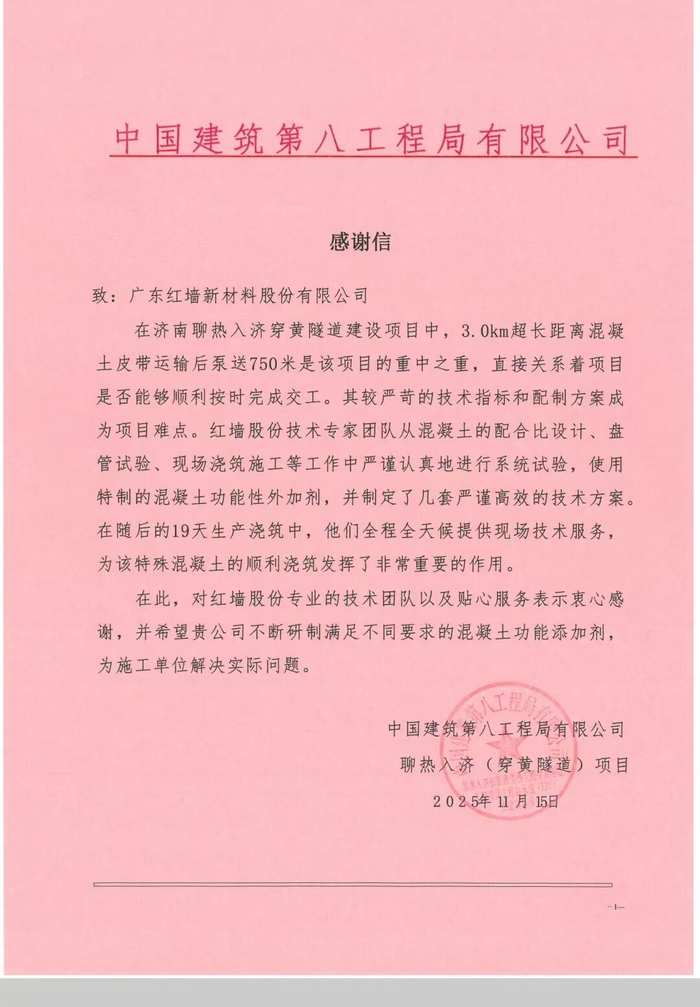 近日,红墙股份收到中建八局“聊热入济”(穿黄隧道)项目的感谢信:在重大民生工程济南“聊热入济”穿黄隧道项目建设中,红墙技术专家团队攻坚克难,从混凝土的配合比设计、盘管试验、现场浇筑施工等工作中严谨认真地进行系统试验,使用特制的混凝土功能外加剂,并制定了多套严谨高效的技术方案,在19 天生产浇筑期内全程全天候驻场服务,成功实现C35自密实混凝土3公里超长距离皮带运输和750米接力泵送的超远距离输送,不仅保障了特殊混凝土顺利浇筑,更刷新了行业同类工程输送纪录,达成国内混凝土工程的创新突破!