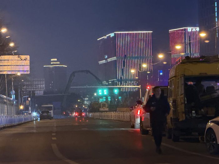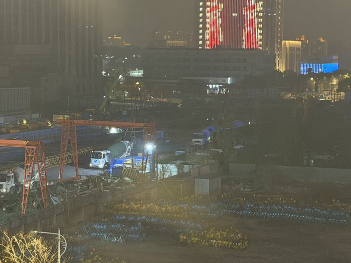 2月12日晚,塌陷核心区域有混凝土灌注车升起灌注臂正在作业。新京报贝壳财经记者俞金旻 摄据现场一位施工人员透露,目前抢修工作主要是以抽水和混凝土灌注为主,具体完成时间尚不明确。贝壳财经记者登上附近一处较高建筑观察到,事发区域已有大量混凝土搅拌车在排队进入。